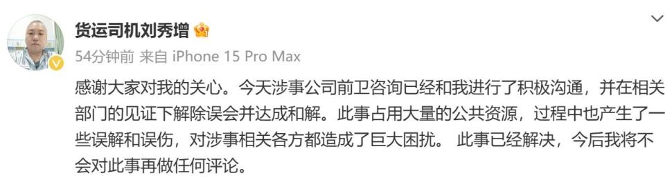 11月27日,货拉拉司机@货运司机刘秀增 发文称:“感谢大家对我的关心。今天涉事公司前卫咨询已经和我进行了积极沟通,并在相关部门的见证下解除误会并达成和解。此事占用大量的公共资源,过程中也产生了一些误解和误伤,对涉事相关各方都造成了巨大困扰。此事已经解决,今后我将不会对此事再做任何评论。”