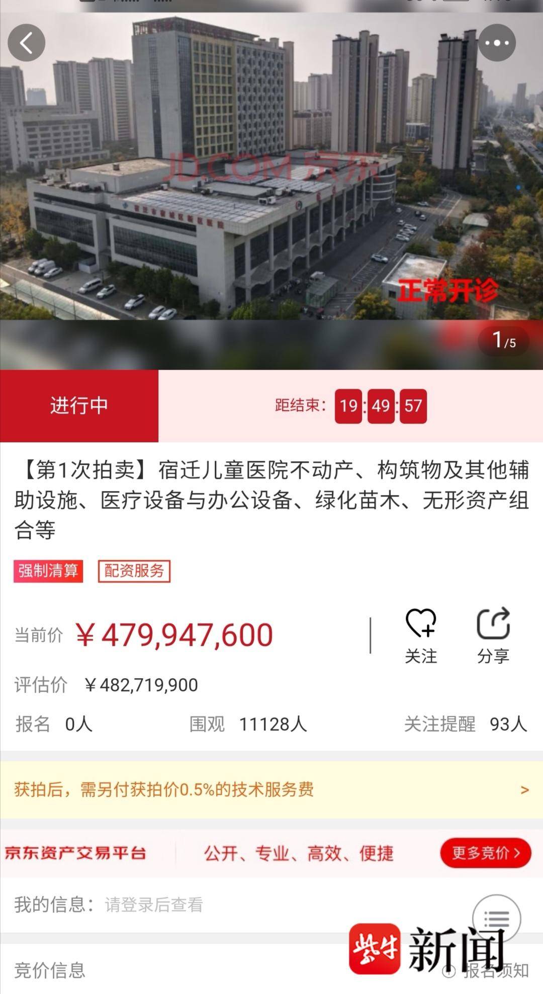 扬子晚报网11月27日讯(记者高峰)11月27日中午12时,宿迁儿童医院在京东资产交易平台开拍,起拍价约为4.8亿元。截至11月27日下午4时,记者注意到,虽有1万多人围观,尚无人报名参与此次拍卖。
