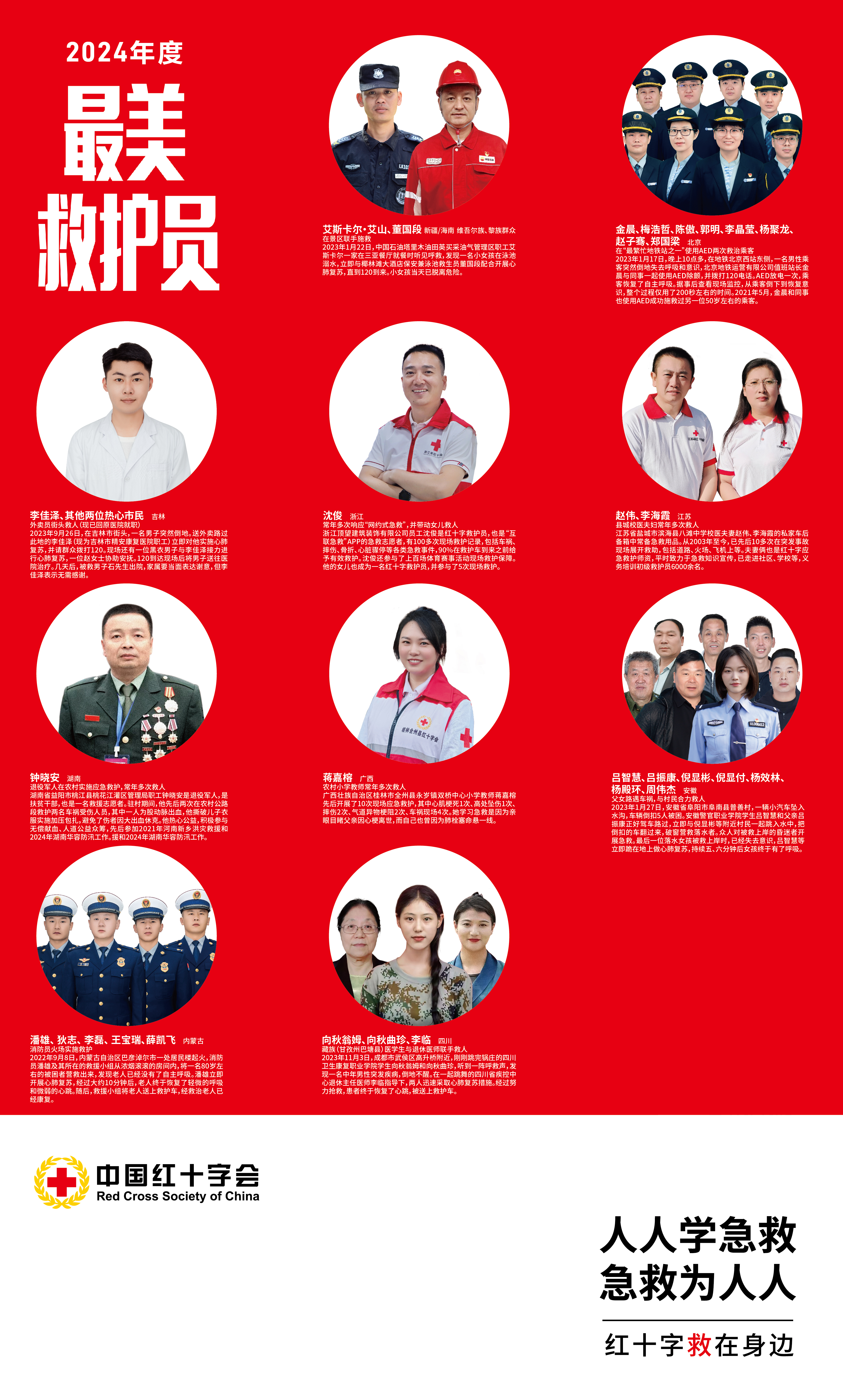 在此次活动中,中国红十字会总会赈济救护部部长边晓公布了“十大最美救护员”名单并对救护员事迹作了介绍。此次获评“十大最美救护员”荣誉的人员来自各行各业,有医生、医学生、警察、教师,也有消防员、外卖员以及普通职工等。