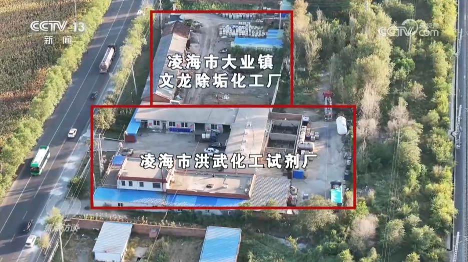 记者来到观众反映的两家化工厂,它们位于凌海市207省道边上,一个叫凌海市洪武化工试剂厂,另外一个没有挂厂名,两个厂区紧挨着。通过无人机航拍可以看到,一辆危险品运输车正在卸货。司机把车上的不明液体灌入厂里地下的储存罐当中,一股股白烟升腾起来。与此同时,隔壁工厂另一辆危险品运输车在将不明液体灌入蓝色的罐子里,同样也可以看到白色的烟雾升起。记者在工厂附近可以闻到一股浓烈的刺鼻味道。这些冒白烟的液体到底是什么呢?又是从哪里来的呢?