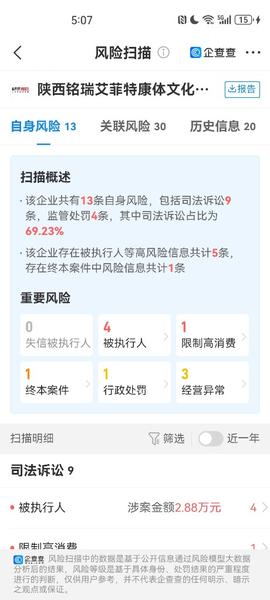 艾菲特健身房锦园店隶属陕西铭瑞艾菲特康体文化传媒有限公司,企查查搜索发现,该公司自身风险13条,包括司法诉讼9条,监管处罚4条,多家分公司有经营异常,法人被限制高消费。致电该公司所留电话,均未能接通。