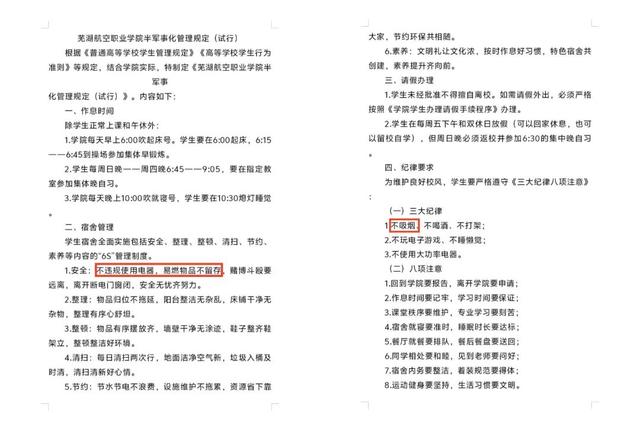 据该校一位学生提供的《芜湖航空职业学院半军事化管理规定(试行)》要求,学生应“不违规使用电器,易燃物品不留存”,“不吸烟、不喝酒、不打架”。