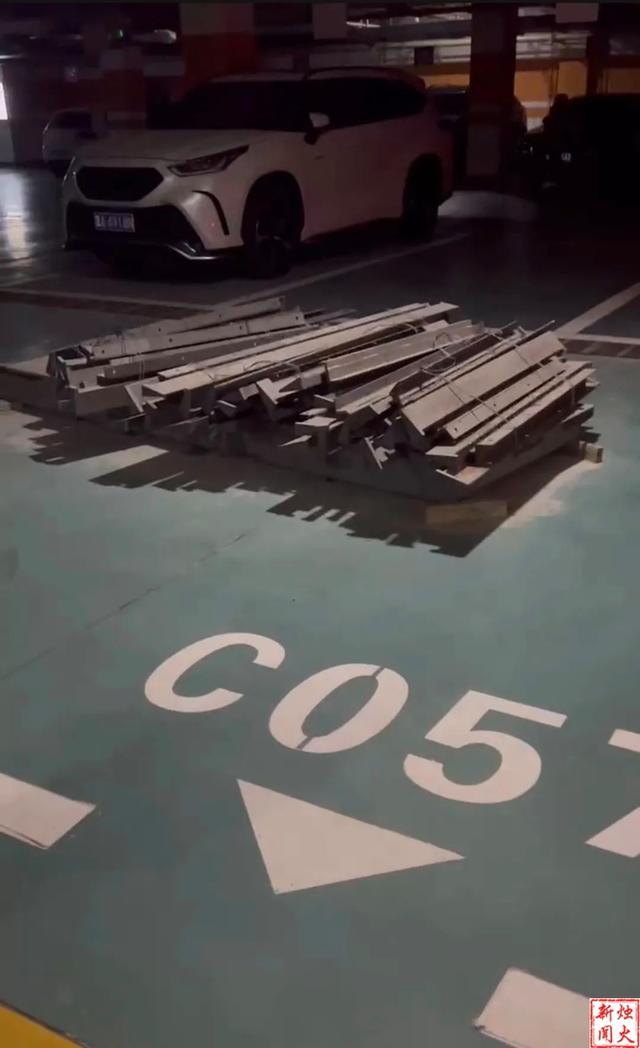 杨女士被这突如其来的状况吓了一跳,冷静下来看到自己所处的位置是C056、C057车位上,脚前的地面上摆放着一大堆铁的建筑材料,她就是被这些东西绊倒的。