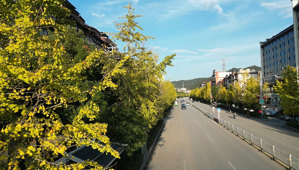 银杏渐染满目金,又到最美赏叶时。眼下,湖南省绥宁县县城绿洲大道银杏路迎来了黄金观赏期,道路两旁成排的银杏树整齐挺立,铺就成“金色大道”。只见黄灿灿的扇叶在阳光的映衬下熠熠生辉,如同披上了一件“黄金甲”。漫步其中,仿佛置身于金色的童话世界一般,令人心驰神往。微风拂过,一片片“金扇”栩栩飘落,给地面铺上了一层“金色地毯”,绚丽的金黄色为城市增添一道温暖靓丽的风景线。