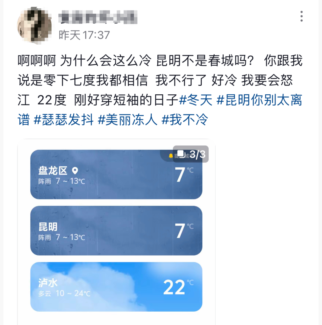 气象专家也表示,进入11月以后,昆明市的最低气温已经普遍低于10℃,未来会慢慢下降至5℃左右,昼夜温差明显加大,所以大家要注意保暖,适时地添加衣物。