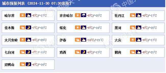 同时,黑龙江大部天寒地冻。大兴安岭北部、齐齐哈尔北部、绥化北部最高气温-14至-12℃,大兴安岭南部、黑河南部、伊春、齐齐哈尔中部-11至-9℃,哈尔滨南部、牡丹江南部-5至-3℃,其它地区-8至-6℃。大兴安岭夜间最低气温-30至-28℃,黑河、伊春、绥化北部、哈尔滨东北部、佳木斯西部-24至-22℃,齐齐哈尔南部、大庆南部、双鸭山、七台河、鸡西、牡丹江东部-16至-14℃,其它地区-19至-17℃。