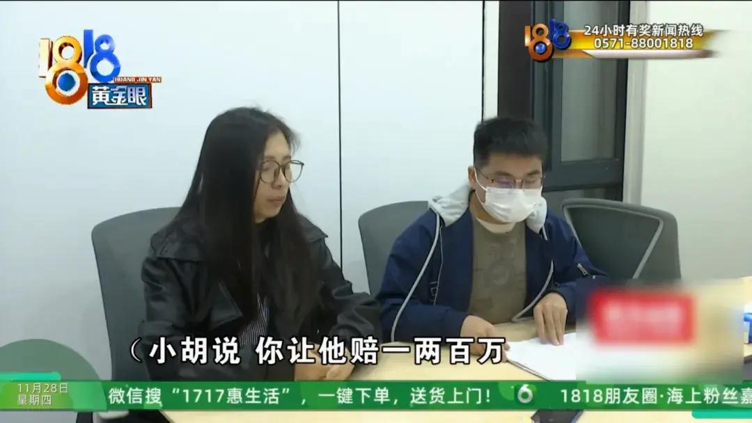 杭州荷博物联科技有限公司 孟助理:你先听我讲,我不知道有一百万两百万这些事情。我们客观去讲,胡某某一个月工资挣一万多块钱,老板脑袋是有“泡” 让他赔一百万,怎么可能呢?