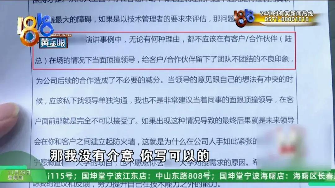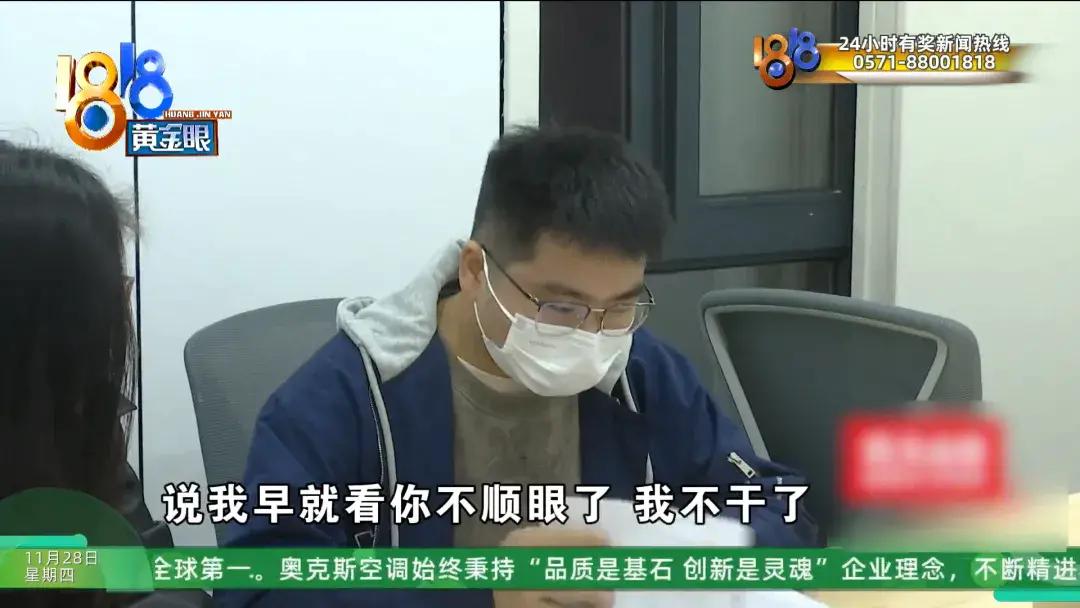 胡先生:我坐在椅子上坐得好好的,是认真在听讲的,后排那边在玩游戏,在玩手机。他那时因为我是试用期嘛,他就指桑骂槐。你能理解我意思吗?就说,哎,戴眼镜的,怎么怎么样。他蹲下来看了我一眼,戴眼镜的,他那句话我不知道怎么说的,我忘了。那时候我就直接来了一句,我说我是认真在听的,他就觉得很没有面子。
