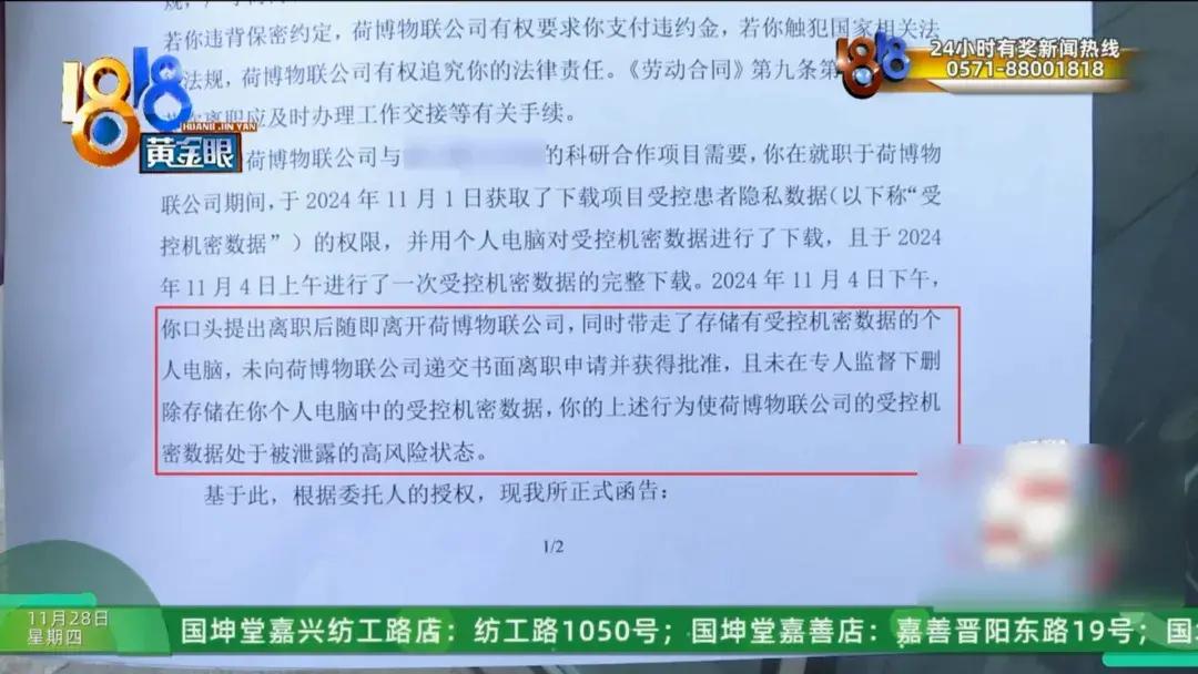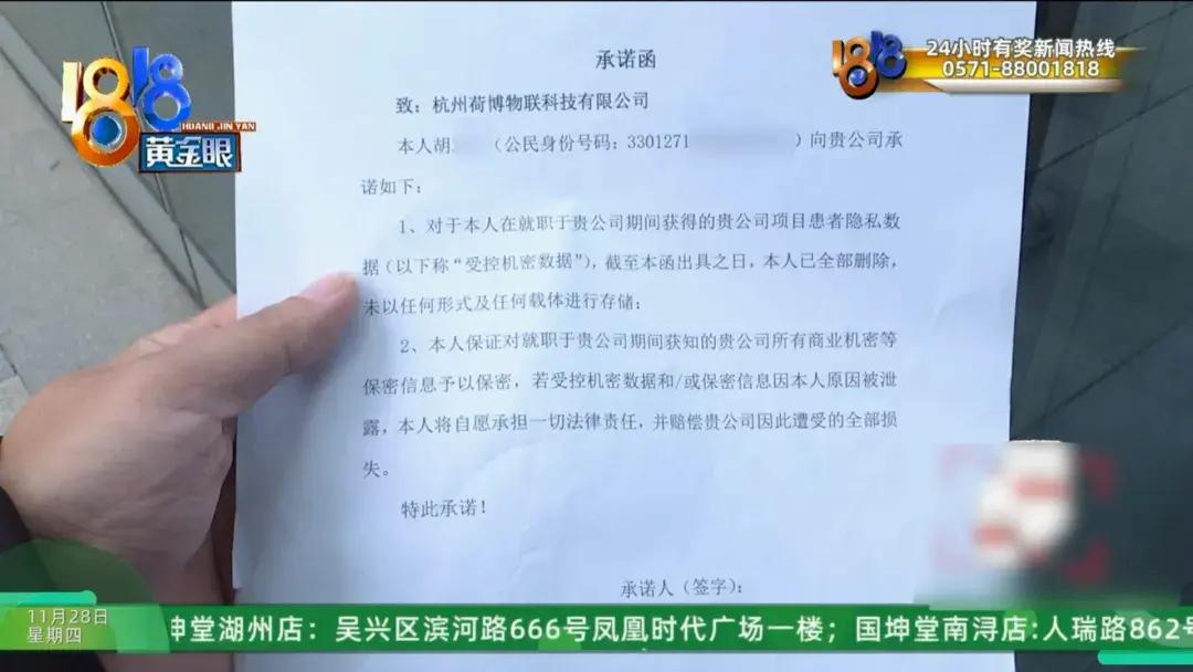 杭州荷博物联科技有限公司 张老板:就是数据这一部分,远程交接,是不符合我们的规范的。现在因为他已经把电脑带回家,已经有两周了,说实话我们也不知道他有没有拷贝。所以我们的要求就是,他写个承诺函就可以了。
