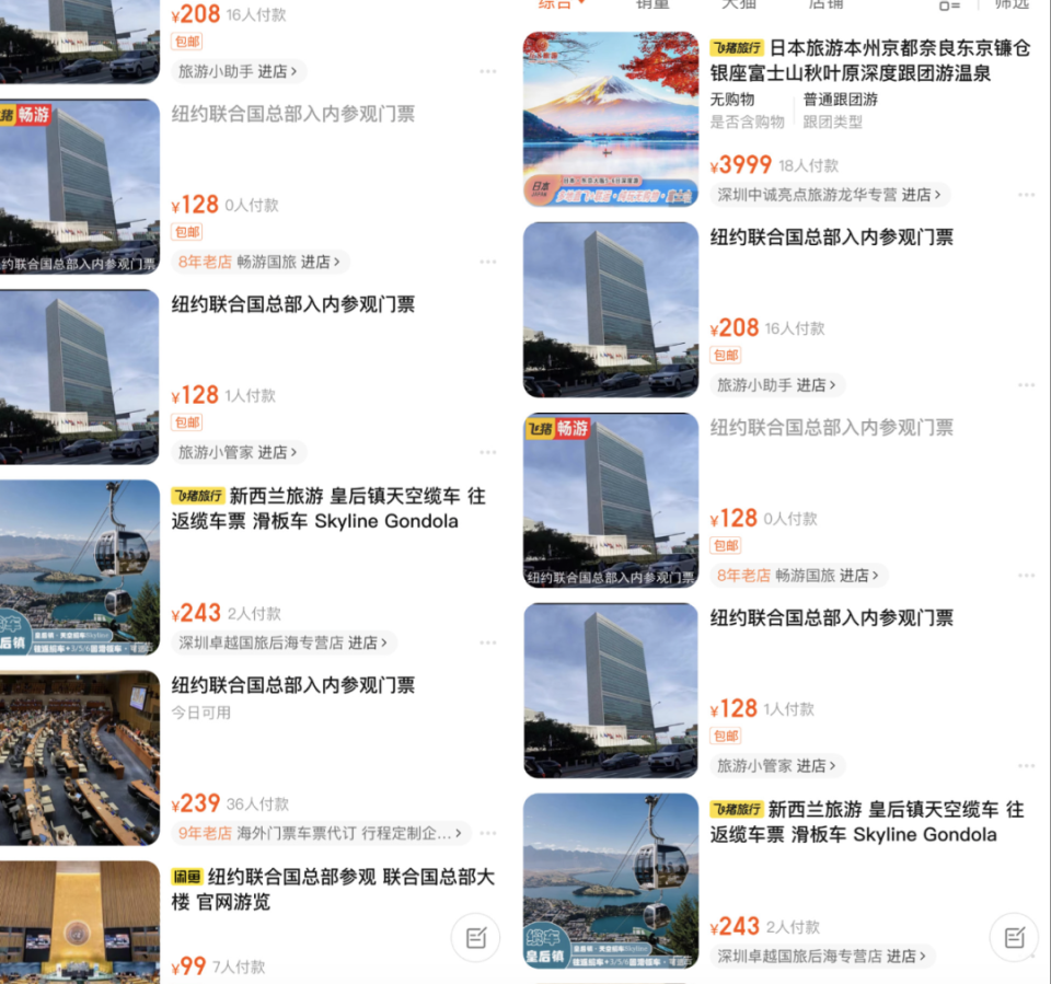 然而仔细对比可以发现,这些打卡联合国的内容似乎出自于同一条流水线,相同的打卡点,相同文案,相同的视频风格,甚至连剪辑的节奏都是相似的。