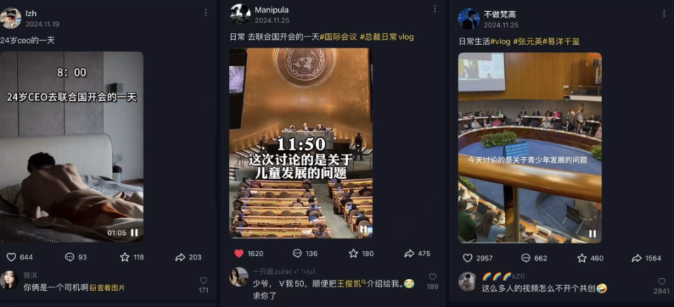 在晒出的帖子中,他们通常身着正装、妆容精致,有的在联合国总部大楼各国旗杆下拍照,有的在空荡会议大堂合影,有的对着话筒演讲。