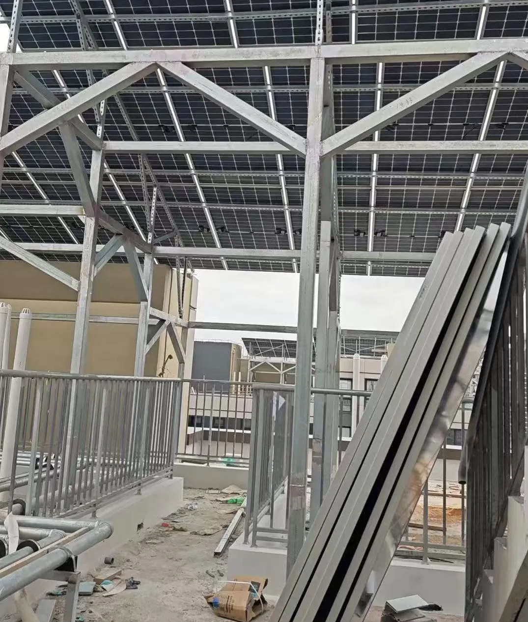 11月26日,记者实地走访,从高处看眉州路1055弄项目,工人正在加紧焊接光伏板立柱。绝大多数顶楼的西面、北面直到东面,甚至顶楼上方的二层平台都已搭建了光伏板,倾斜角度基本在30度以上。为了与二层平台“拉平”,部分西面光伏板用搭建的金属框架结构抬高,金属杆嵌入水泥墩进行固定。记者数了数,48块或72块拼接而成的大型光伏组块不少,组块边界几乎都与楼顶边缘齐平。