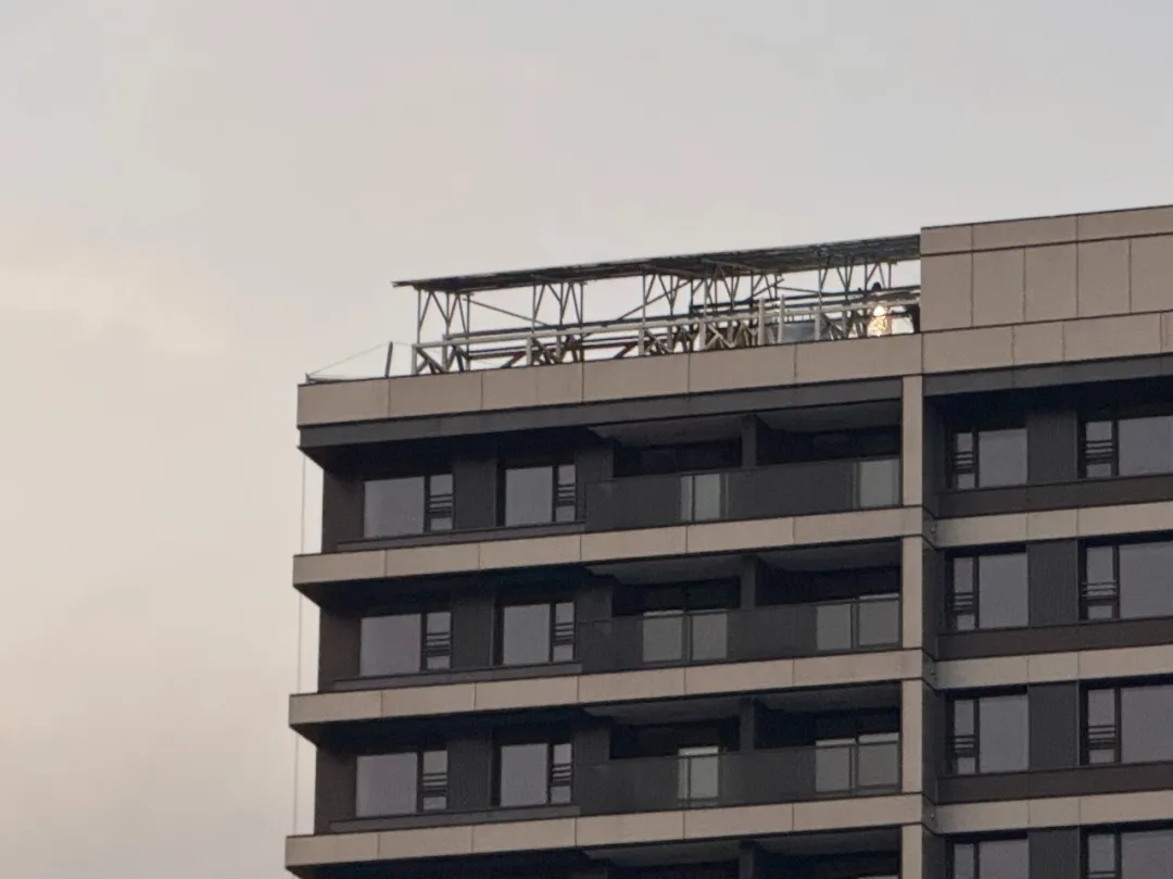 今年10月,眉州路1055弄有业主注意到部分屋顶大面积光伏设施的落地效果,不管在面积和高度上都超出了预料,“光伏板已经搭建到屋顶边缘。”在业主无人机“监工”中,光伏建筑采用在他们看来更为节省的结构胶装方式,担心抗风能力不够强。满屋顶的金属立柱和黑色面板更令业主觉得“拉低”了住宅颜值。