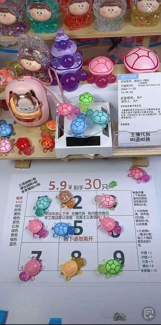 “真的挺‘上头’的,没一会儿就下了好几单。”刘女士的孩子今年上6年级,最近迷上了这种盲盒游戏,晚上写完作业,或是周末休息,没事儿就要拉着刘女士在直播间一起“开乌龟”。“开始我也是好奇,结果开了几单之后连我也有点上瘾,不停能对碰上,或者颜色成功,就不停地继续开,有时候一晚上能开出几十只乌龟。”刘女士说,现在家里已经攒了许多小乌龟,孩子还在惦记着到潮玩集市的线下实体店去现场“开盲袋”。