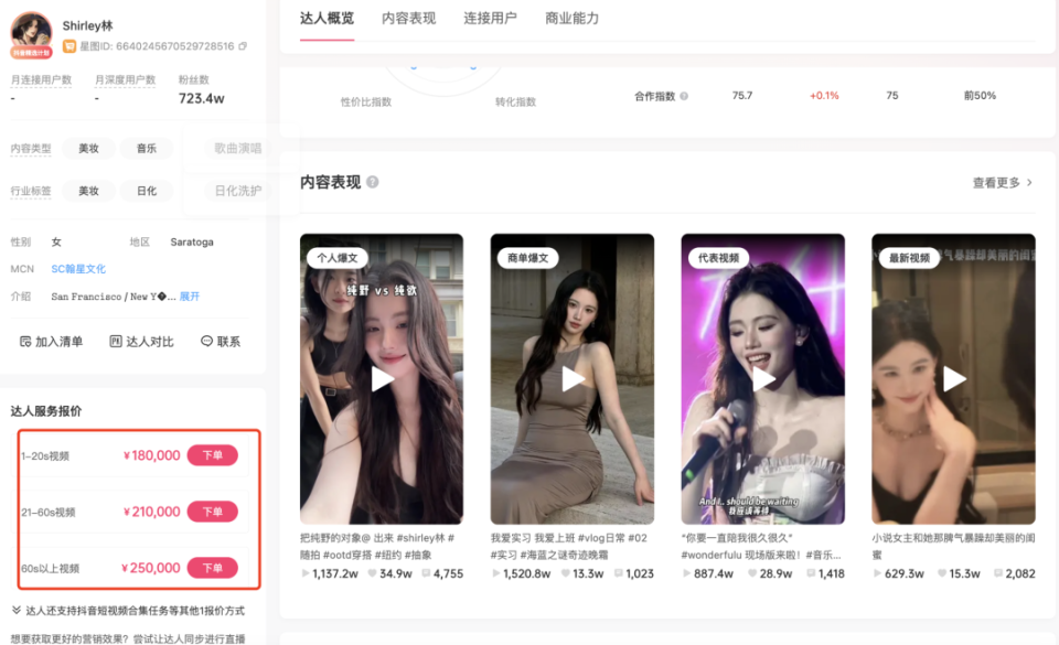 巨量星图显示,“Shirley林”是MCN机构SC翰星文化旗下的达人,1~20秒广告报价18万,21~60秒广告报价21万,超60秒广告报价25万元。