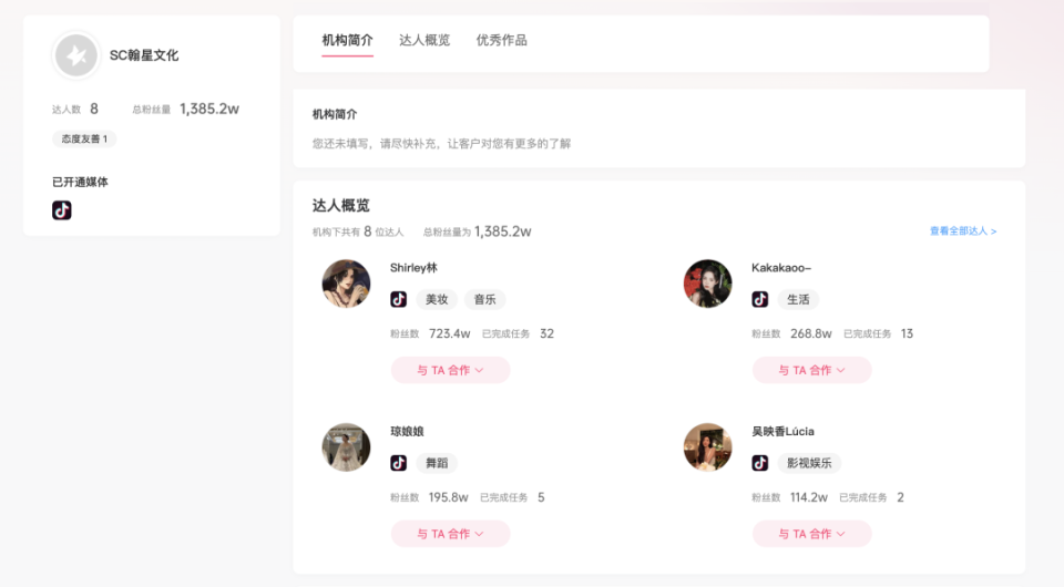 除了“Shirley林”外,该机构旗下另有多个百万粉达人,涉及生活、影视、时尚等多个领域。
