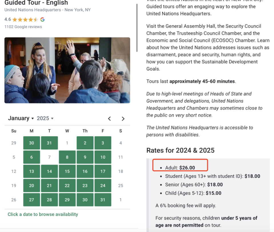 记者查询发现,联合国官网有着预约参观的入口,成人价格为26美元,13岁以上学生凭学生证支付18美金,5-12岁儿童支付15美金,60岁以上老人支付18美金,现场还提供多国语言的导游服务。相关预约已经到了2025年1月份。