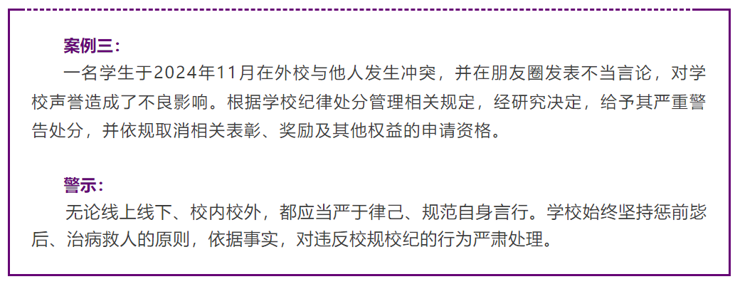 红星新闻记者注意到,此次共通报了三个案例,其中的案例三称,一名学生在外校与他人发生冲突,并在朋友圈发表不当言论,对学校声誉造成了不良影响。根据学校纪律处分管理相关规定,经研究决定,给予其严重警告处分,并依规取消相关表彰、奖励及其他权益的申请资格。