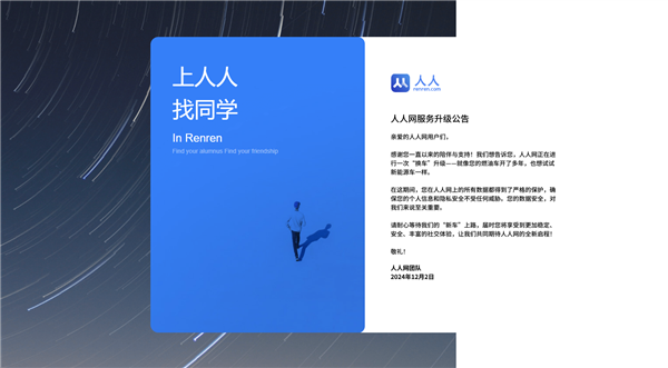 目前,人人网团队在官网发布了一则“服务升级公告”,宣布正在进行一次“换车”升级——“就像您的燃油车开了多年,也想试试新能源车一样。”