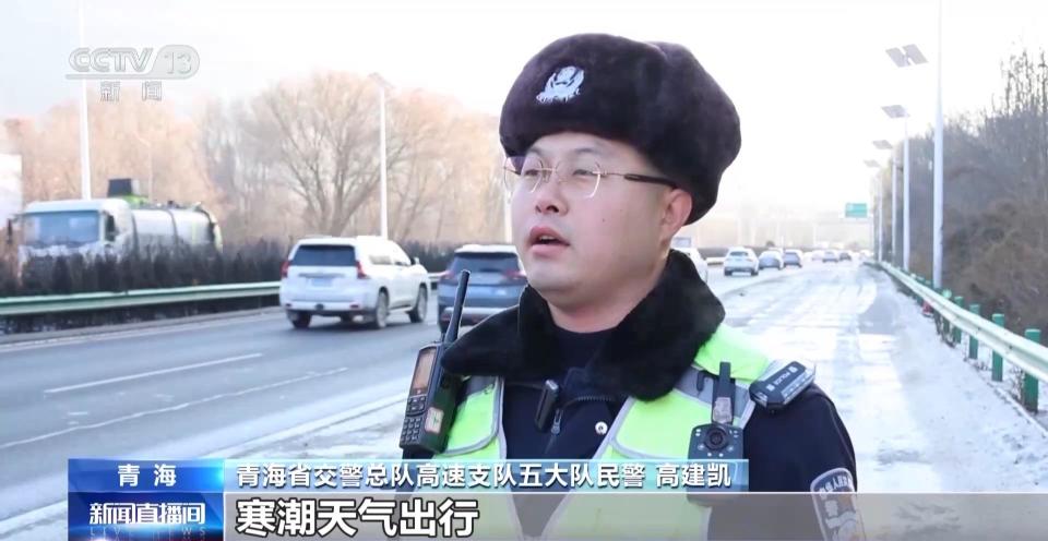 青海省交警总队高速支队五大队民警 高建凯:寒潮天气出行,降雪天气会导致道路湿滑、能见度比较低。高海拔地区,尤其那些桥面、隧道出入口以及阴面路段积雪、结冰现象比较严重,还有长下坡路段,大型车辆转弯时注意减速,请驾驶人员采取防滑措施,减速慢行。