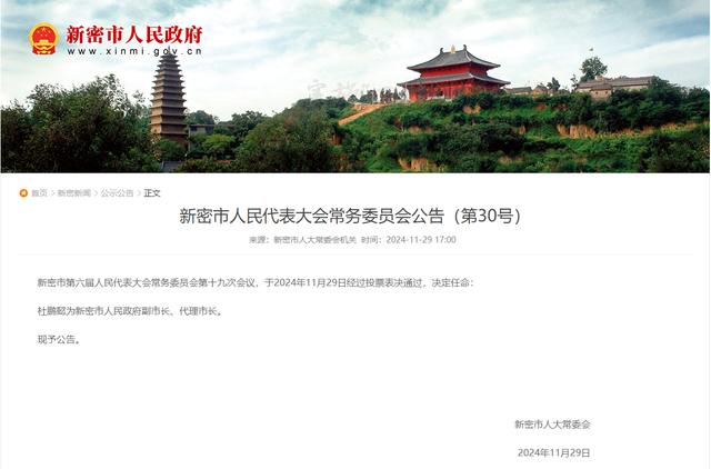 新密市第六届人民代表大会常务委员会第十九次会议,于2024年11月29日经过投票表决通过,决定任命: