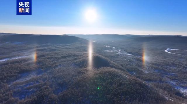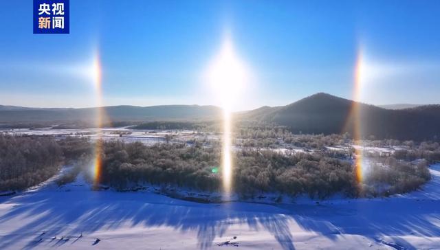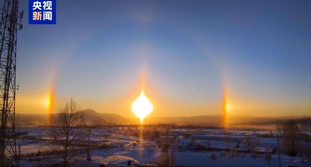 画面中,三个太阳同时“上班”,站位呈现中间高、两边低的布局。据了解,本次幻日景观是因近期根河市气温极低,高空中出现卷层云。由于高空中卷层云里的小冰晶整齐排列,阳光照射后发生规律折射,从而在太阳两边形成较大的光斑,看上去就像是出现了多个太阳。