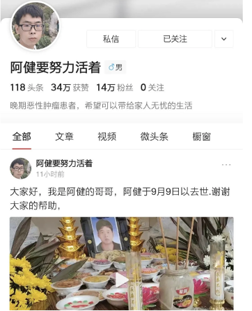 此前34岁网红抗癌博主阿健因肠癌去世,一年时间从帅哥变枯槁。