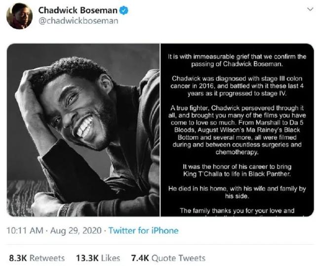 电影《黑豹》男演员查德维克·博斯曼也是罹患结肠癌去世,终年43岁。