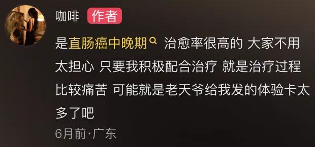 而在5月22日的视频中,博主回应称自己是直肠癌中晚期,治愈率很高,但过程可能会比较痛苦。