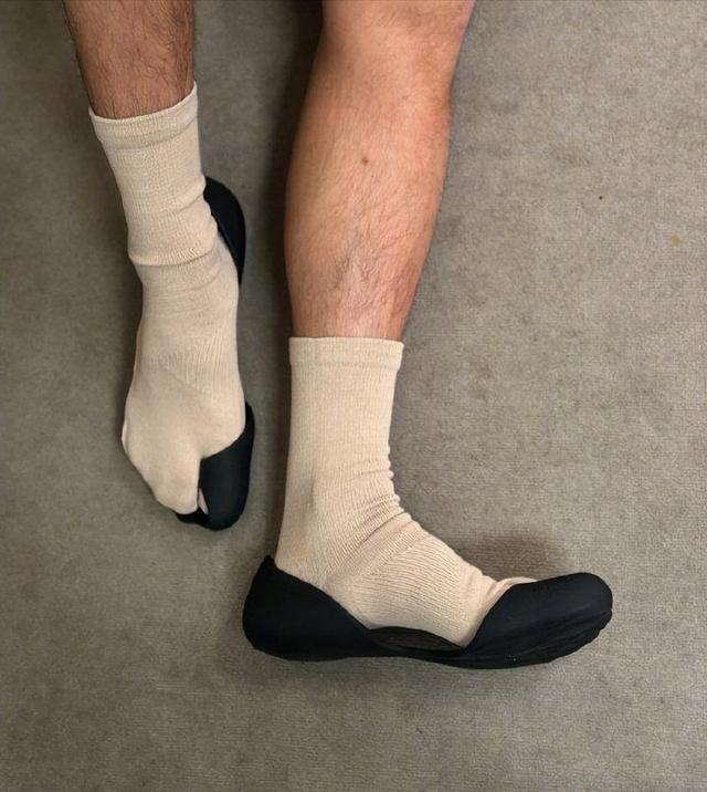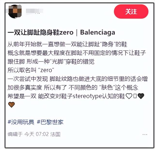 疑似设计者今天在社交平台公开设计理念:从前年开始就一直想做一双能让脚趾“隐身”的鞋,概念就是想要最大程度在脚趾不用固定的情况下让鞋子跟住脚,形成一种“光脚”穿鞋的错觉,所以取名叫 “zero”。