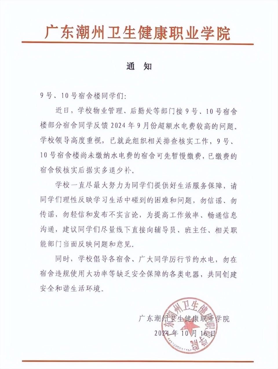 上述网友称,发现9月的电费畸高后,她们向学校作了反映。10月16日,学校就此发通知称:近日,学校物业管理、后勤处等部门接9号、10号宿舍楼部分宿舍同学反馈2024年9月份超额水电费较高的问题。学校领导高度重视,已就此组织相关排查核实工作。9号、10号宿舍楼尚未缴纳水电费的宿舍可先暂慢缴费,已缴费的宿舍待核实后据实多退少补......