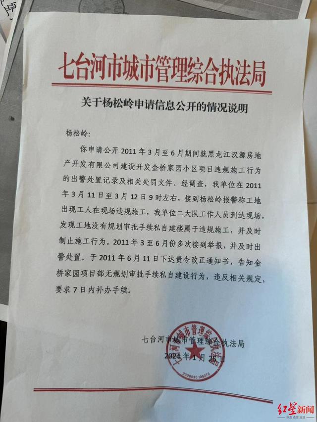 2024年1月25日,七台河执法局依杨松岭的申请出具的一份信息公开情况说明显示,经调查,执法局在2011年3月11日至12日9时左右,接到杨松岭报警,称工地出现工人违规施工,工作人员到达现场发现工地没有规划审批手续私自建楼属于违规施工,并及时制止施工行为。2011年3月至6月,也多次接到举报,并及时出警处置。