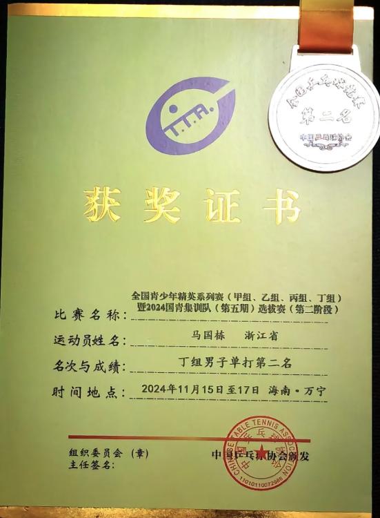在乒乓球全国赛中获得亚军