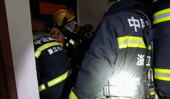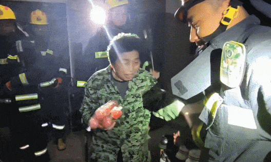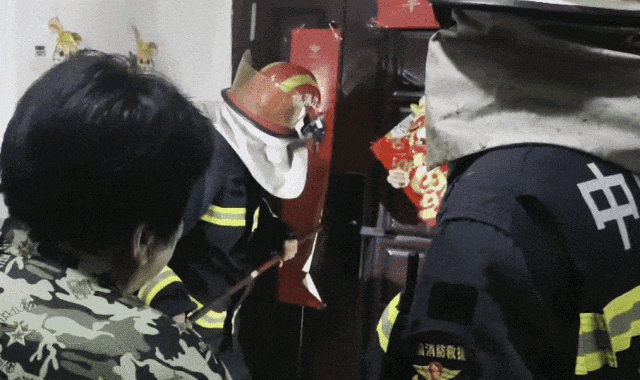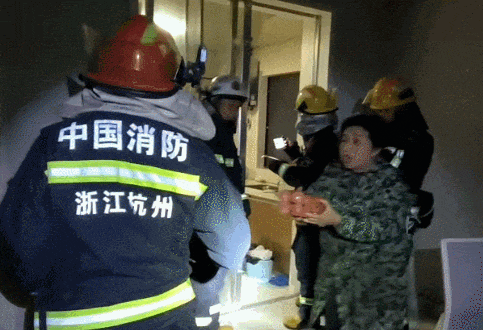 她把餐桌上放着的两盒水果挨个往消防员怀里塞