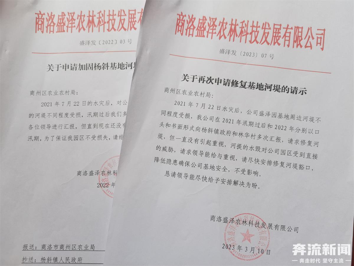 商洛盛泽农林科技发展有限公司紧邻汝河。“ 2021年的一次水灾将公司基地西边和北边的河堤不同程度冲毁。洪水过后,我给杨斜镇政府和区农业农村局主要领导进行了汇报,申请修复河堤,但没有得到处理。”贾小卫提供了《关于申请加固杨斜基地河堤的请示》和《关于再次申请修复基地河堤的请示》两份文件,落款时间分别是2022年4月和2023年3月,报送单位是商州区农业农村局,抄送单位是杨斜镇人民政府。