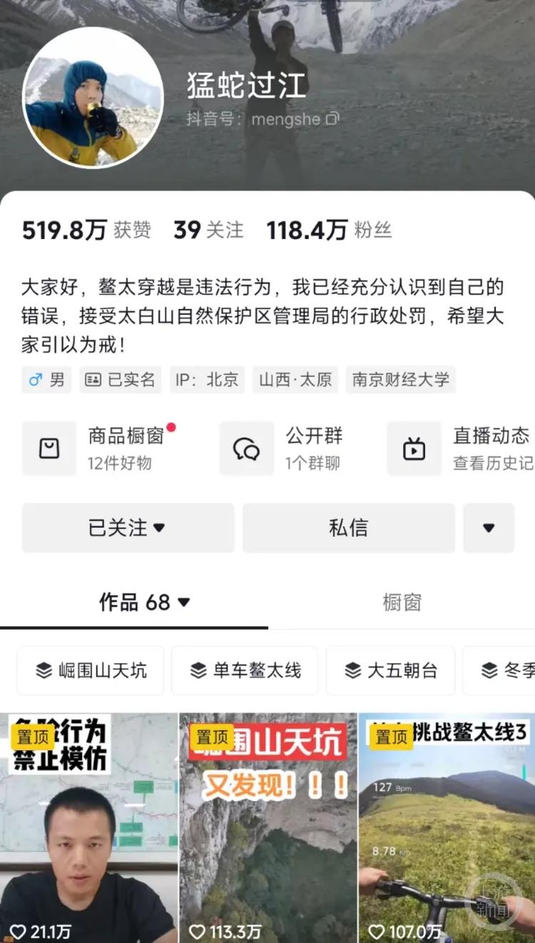 记者查看“猛蛇过江”的短视频社交账号发现,他在个人账号主页显著位置发布了道歉声明。“大家好,鳌太穿越是违法行为,我已经充分认识到自己的错误,接受太白山自然保护区管理局的行政处罚,希望大家引以为戒!”