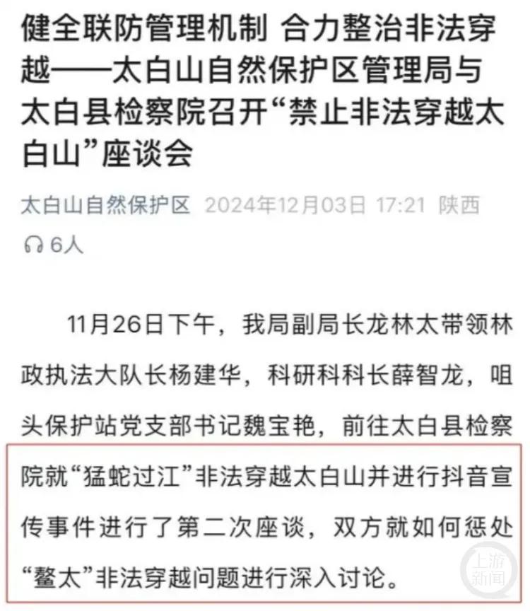 3日,微信公众号“太白山自然保护区”发布文章称,陕西太白山国家级自然保护区管理局与太白县检察院就整治和禁止“非法穿越太白山”召开座谈会,其中多次提及曾在鳌太线发现尸体的博主“猛蛇过江”,并就如何惩处问题进行了讨论。