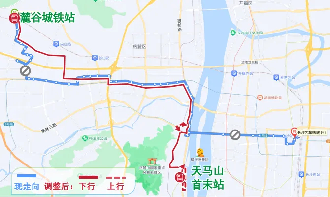 上行:从天马山首末站发车,经潇湘路-牌楼路-麓山路-枫林路-溁湾路-银盆路-潇湘大道-银盆路-桐梓坡路-西二环辅道-麓天路-麓谷大道-望青路-青山路-东方红路-立新路至麓谷城铁站。