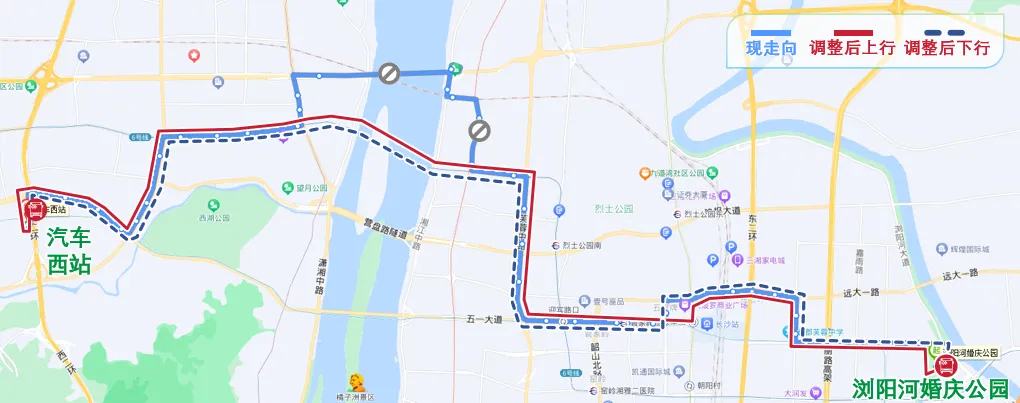下行:从浏阳河婚庆公园发车,经浏阳河大道-荷花路-马王堆路-远大路-晓园路-五一路-芙蓉路-湘雅路-湘雅路过江隧道-桐梓坡路-金星路-枫林路-西二环至汽车西站。(不再行经黄兴路、开福寺路、银盆岭大桥、银盆南路)