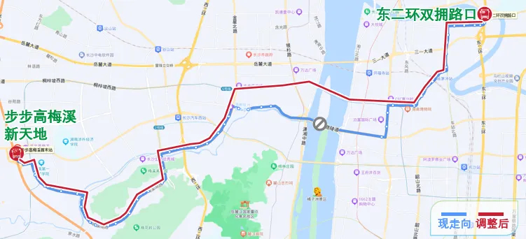 上行:从步步高梅溪首末站发车,经枫香路-枫林路-东方红路-梅溪湖路-梅溪湖大桥-麓景路-金星路-桐梓坡路-湘雅路过江隧道-湘雅路-德雅路-开福大道-双拥路-东二环辅道至东二环双拥路口。