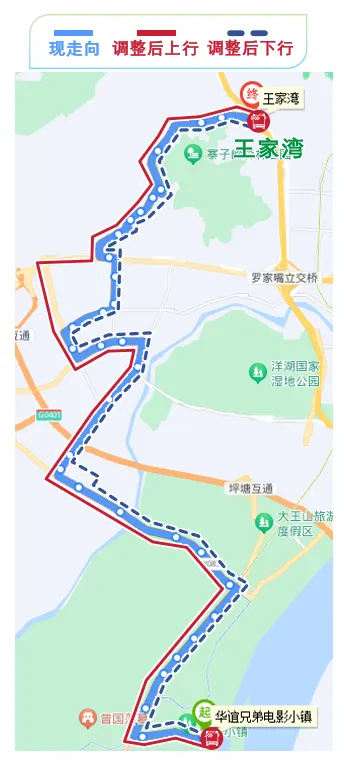 下行:从华谊兄弟电影小镇发车,经星光路-坪塘路-潭州大道-莲坪路-木梓塘路-紫苑路-含浦大道-学士路-象嘴路-联丰路-车塘河路-云栖路-玉佩路-含浦大道-含浦路至王家湾。(不再行经莲坪路木梓塘路口-含浦大道口段)