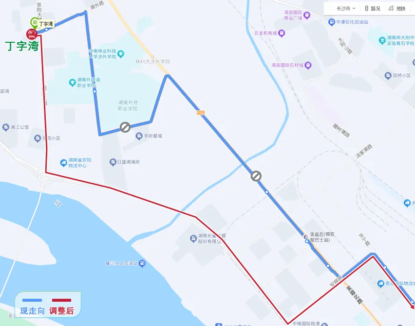下行:从海洋半岛首末站发车,经栖凤路-四方大道-东二环辅路-三一大道-车站路-开福大道-福元路-芙蓉路-青竹湖路-华宁路-安顺路-芙蓉路-兴旺路-湘江路-京阳大道-湖外路至丁字湾。(不再行经枫树路、向东路、外贸路、芙蓉路外贸路口-安顺路口段)