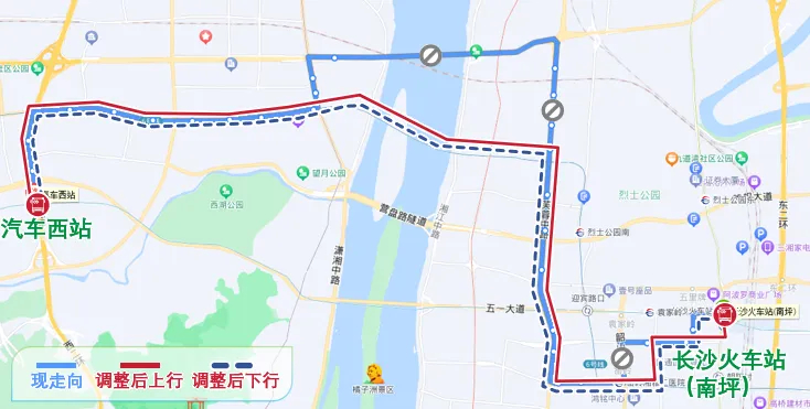 下行:从长沙火车站(南坪)发车,经车站路-五一大道-朝阳路-解放路-曙光路-人民路-芙蓉路-湘雅路-湘雅路过江隧道-桐梓坡路-西二环辅道-西二环至汽车西站。(不再行经芙蓉路湘雅路-三一大道段、三一大道、银盆岭大桥、银盆南路)