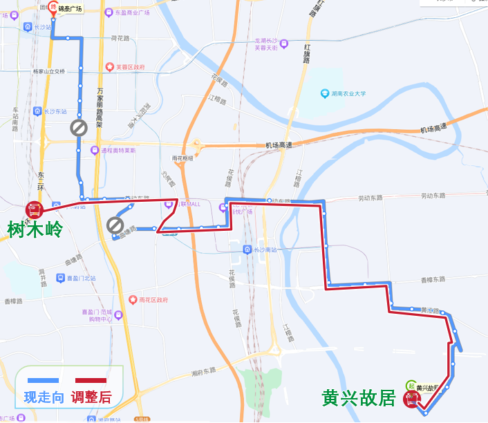 从黄兴故居发车,经X046-树新路-东四路-黄江路-高塘坪路-香樟路-国展路-劳动路-花侯路-曲塘路-沙湾路-劳动路至树木岭立交桥掉头接原线返回黄兴故居。往返运行。(不再行经曲塘路路沙湾路口-古曲路口路段、古曲路、马王堆路、荷花路、东二环。)