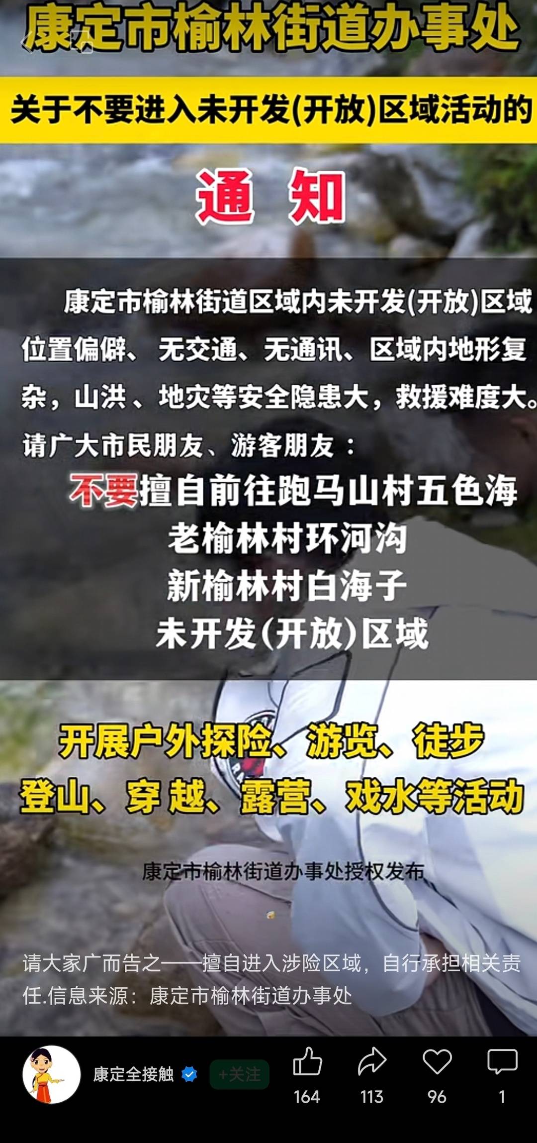 康定市榆林街道办就曾就辖区内未开发(开放)区域发布禁令,其中就包括白海子。通知显示,康定市榆林街道区域内未开发(开放)区域位置偏僻、无交通、无通讯、区域内地形复杂,山洪、地灾等安全隐患大,救援难度大。因此请广大市民和游客不要擅自前往跑马山村五色海、老榆林村环河沟、新榆林村白海子未开发(开放)区域开展户外探险、游览、徒步、登山、穿越、露营、戏水等活动。