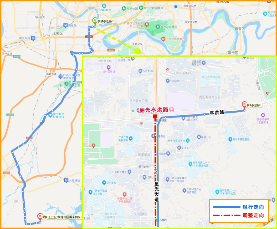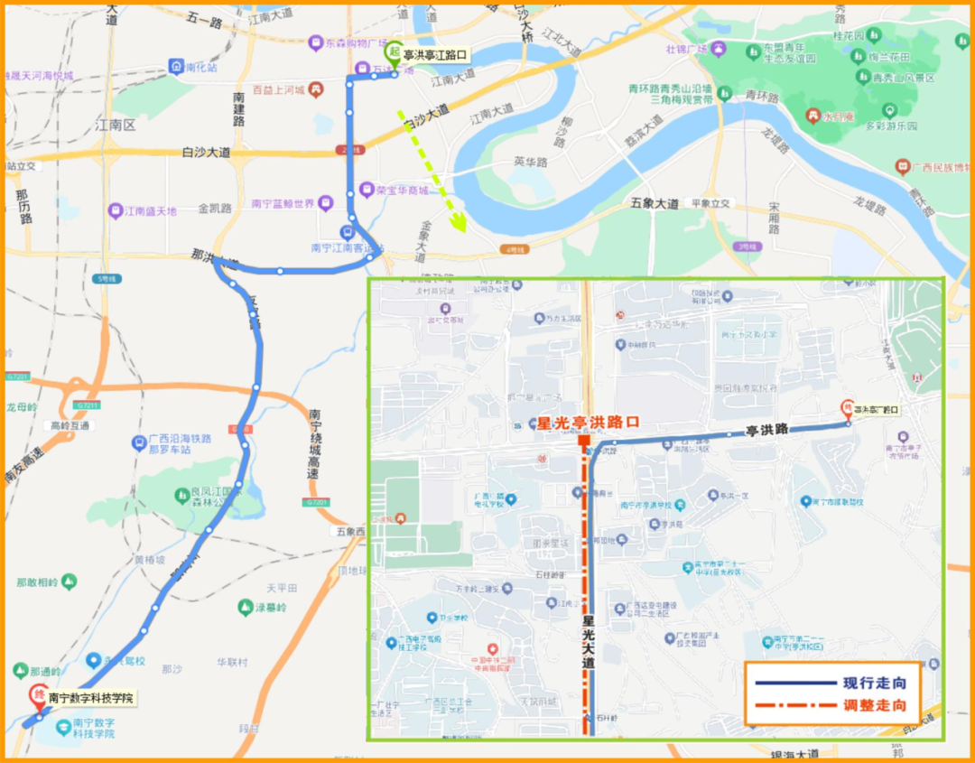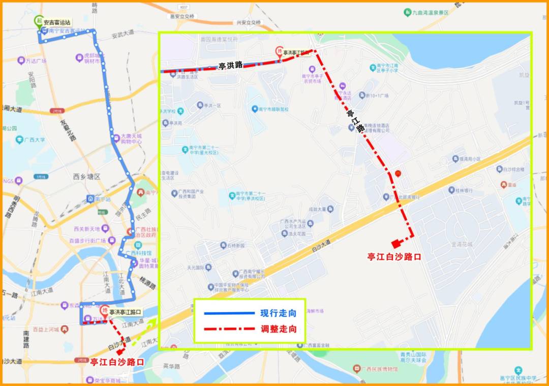 调整后,K7路区间由星光亭洪路口始发,途经星光大道、银海大道、那洪大道、友谊路至南宁数字科技学院终点,取消“亭洪亭江路口、亭洪路东、亭洪星光路口(南面)”2对往返停靠站点及1个单边停靠站点,线长约16.2公里,营运时间6:30-22:00,实行一票制2元/人次。