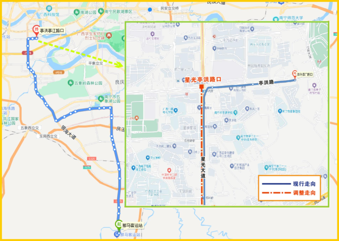 调整后,809路由星光亭洪路口始发,途经星光大道、银海大道、凤凰路、平乐大道、G325国道至那马客运站终点,取消“亭洪亭江路口、亭洪路东、亭洪星光路口(南面)”2对往返停靠站点及1个单边停靠站点,线长约25.7公里,营运时间6:30-20:30,实行一票制2元/人次,实行“站点响应式停靠”运营模式。