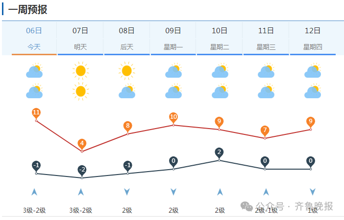 今天下午到明天白天多云转晴,北风3~4级,明晨最低气温济阳区、莱芜区、钢城区、商河县、南山区、起步区-4℃左右,市区及其它区县-1℃左右,明天最高气温4℃左右。