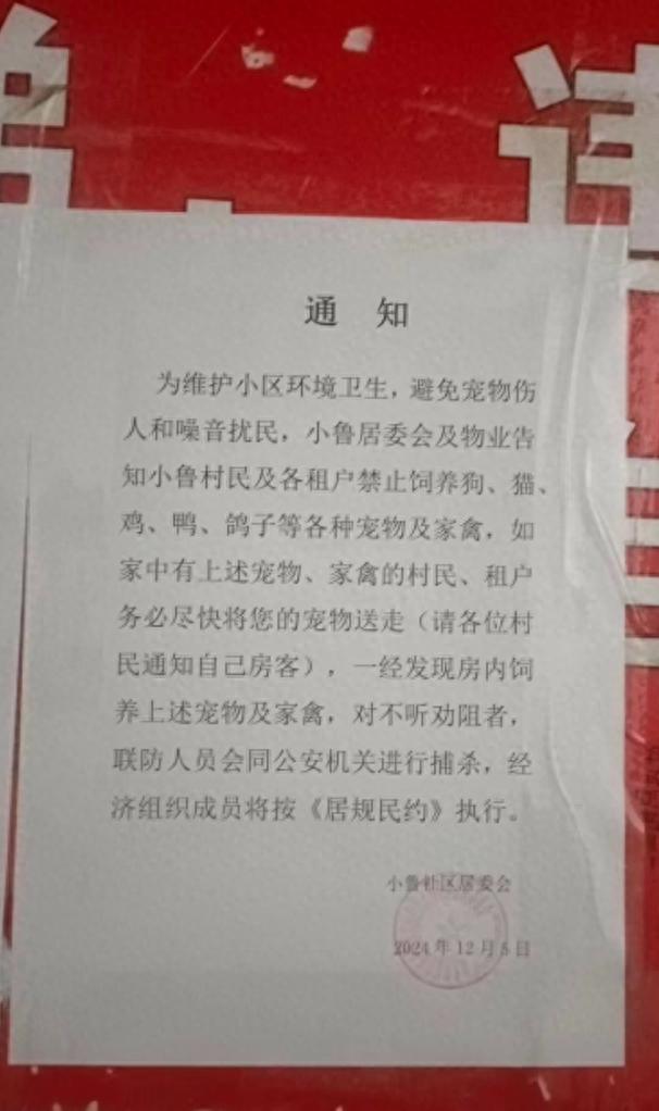记者看到,这则《通知》称,为维护小区环境卫生,避免宠物伤人和噪音扰民,小鲁居委会及物业告知小鲁村民及各租户,禁止饲养狗、猫、鸡、鸭、鸽子等各种宠物及家禽。如家中有上述宠物、家禽等,务必尽快将宠物送走(请各位村民通知自己房客),一经发现房内饲养上述宠物及家禽,对不听劝阻者,联防人员将会同公安机关进行捕杀,经济组织成员将按《居规民约》执行。这份12月5日张贴的《通知》,落款处盖有小鲁社区公章。
