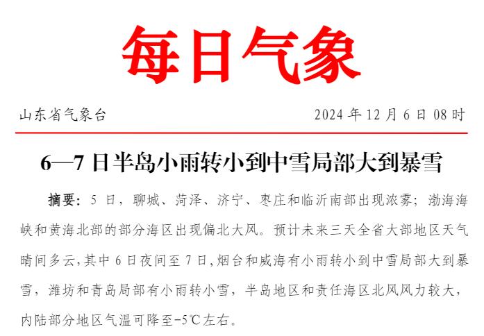 5日,聊城、菏泽、济宁、枣庄和临沂南部出现浓雾;渤海海峡和黄海北部的部分海区出现偏北大风。预计未来三天全省大部地区天气晴间多云,其中6日夜间至7日,烟台和威海有小雨转小到中雪局部大到暴雪,潍坊和青岛局部有小雨转小雪,半岛地区和责任海区北风风力较大,内陆部分地区气温可降至-5℃左右。